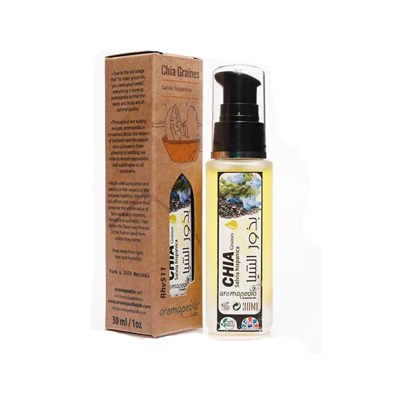 Aromapedia Huile Chia Graines Bio, on retrouve sa graine un peu partout, elle est notamment de plus en plus présente, Origine Maroc, fabriqué au maroc (30ml)…