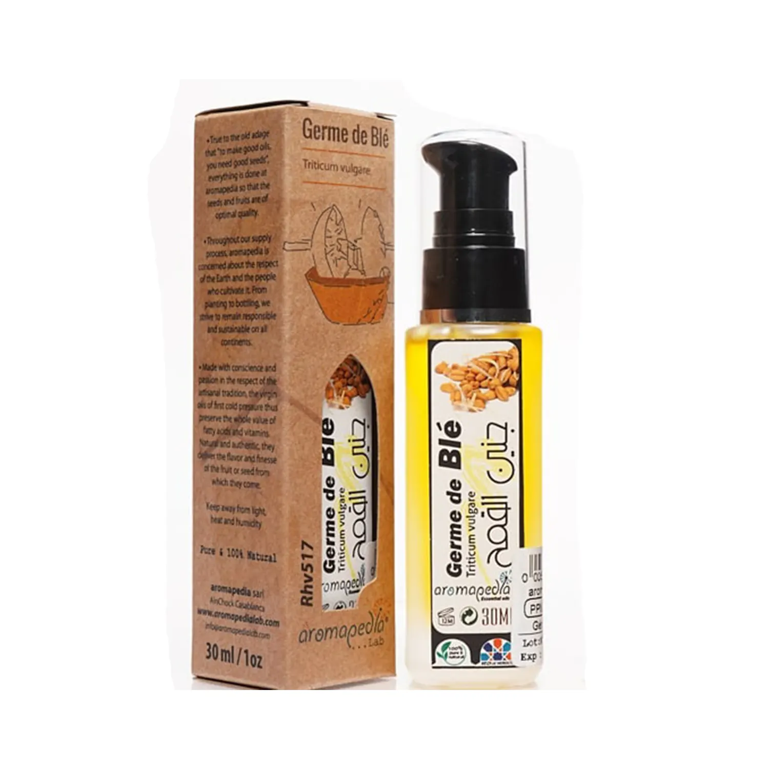 Aromapedia Huile Germe de Blé Bio, très nourrissante, elle est riche en vitamines A, C, E, en oméga-6 et en bêta-carotène, Origine Maroc, fabriqué au maroc (30ml)…