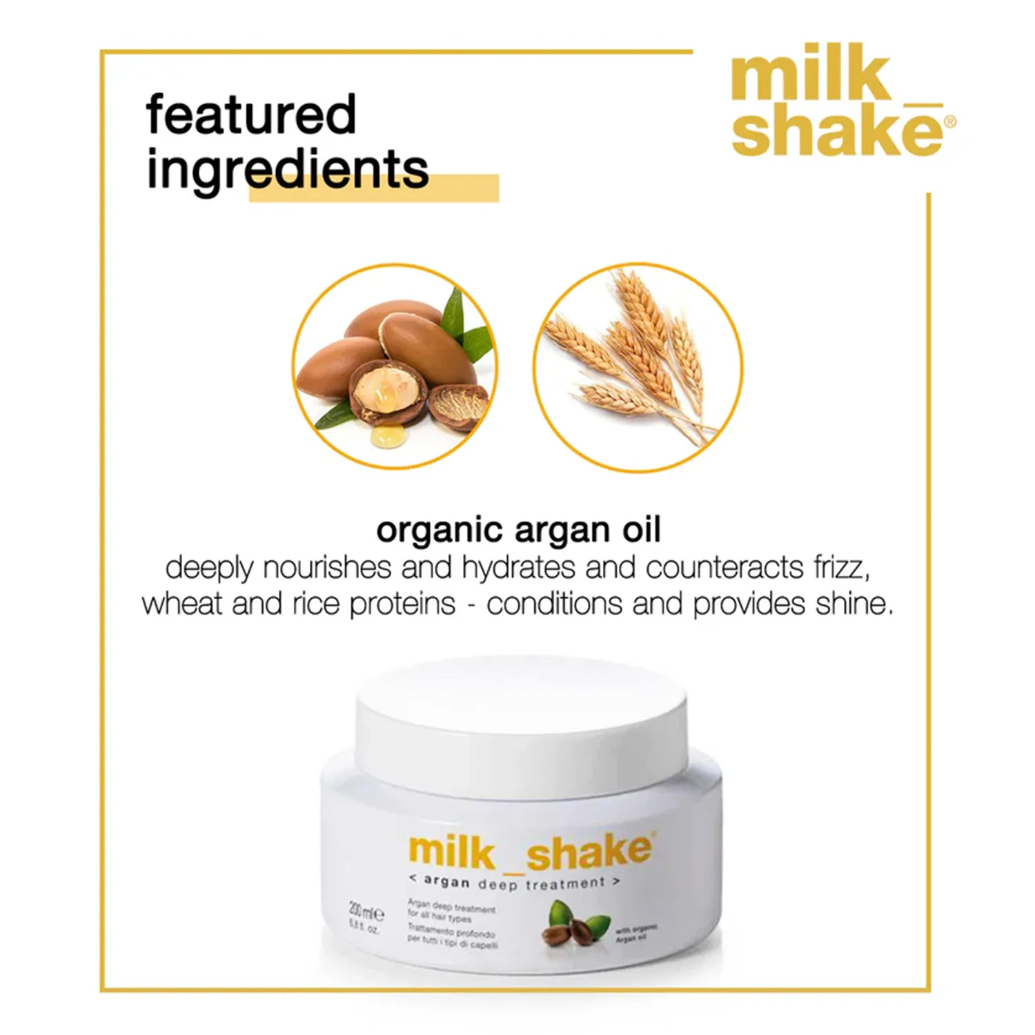 milk shake Argan Deep Treatment est un incontournable pour toute personne ayant des cheveux difficiles à manipuler, épais et ondulés. Nourrit les cheveux et combat les frisottis grâce à sa formule à base d’huile d’argan bio et de protéines de blé. Scelle la cuticule et donne douceur, brillance et maniabilité, protégeant la couleur des cheveux. (200ml)