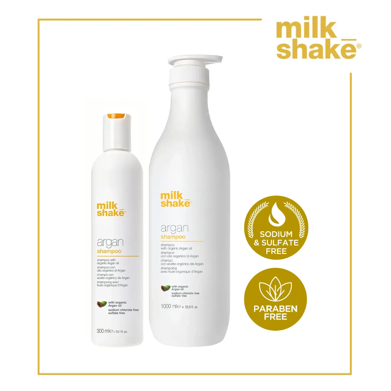 milk shake Argan Shampoo à l’huile d’argan biologique pour tous types de cheveux. Il nettoie délicatement, grâce à sa formule unique à base d’huile d’argan. Hydrate, conditionne et nourrit immédiatement, éliminant l’effet crépu, laissant les cheveux doux et brillants et préservant l’intégrité de la couleur. (Shampoing sans sulfate et chlorure de sodium) (300ml)
