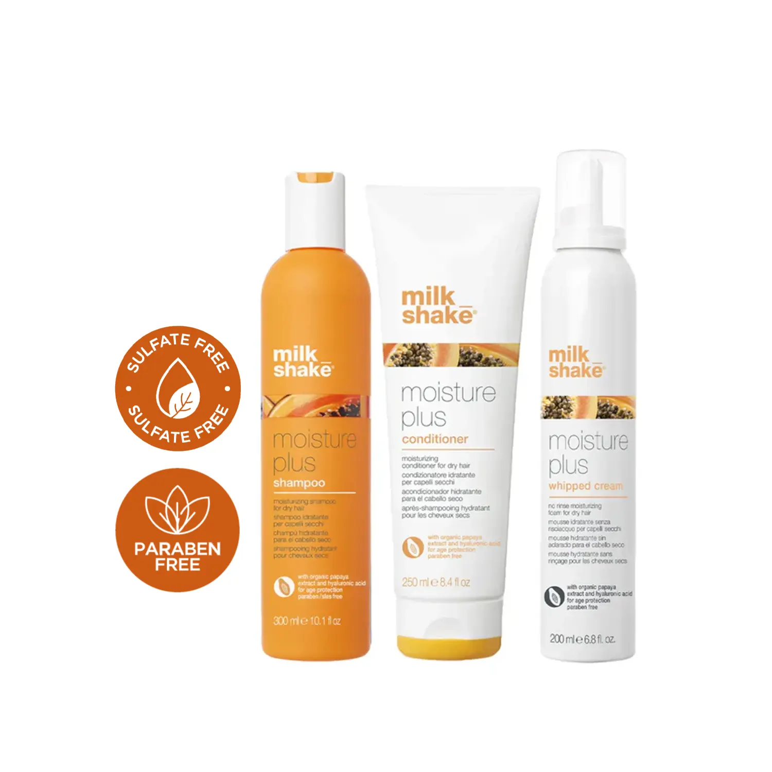 milk_shake® Moisture Plus est un ensemble hydratant pour cheveux secs. Il améliore la douceur et la maniabilité tout en maintenant un équilibre hydrique optimal. Ensemble milk_shake® Moisture Plus contient de l’extrait de papaye biologique, Integrity 41® et de l’acide hyaluronique aux propriétés anti-âge. Protège la couleur des cheveux.