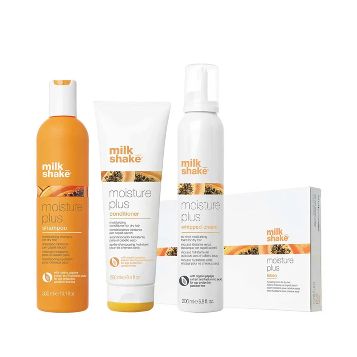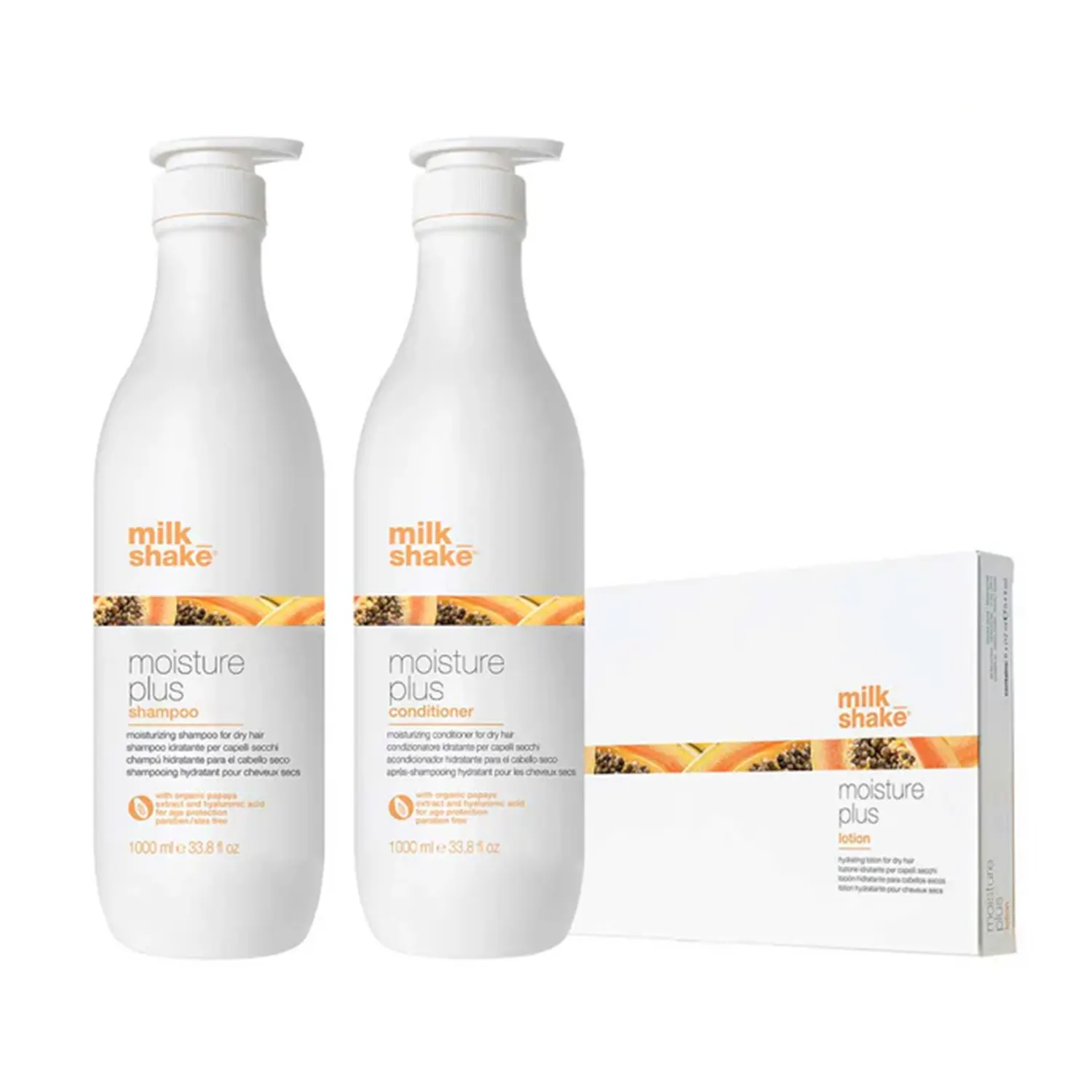 Pour une hydratation accrue, des cheveux visiblement plus sains, doux et brillants, associez ce trio à la milk_shake Moisture Plus Lotion.