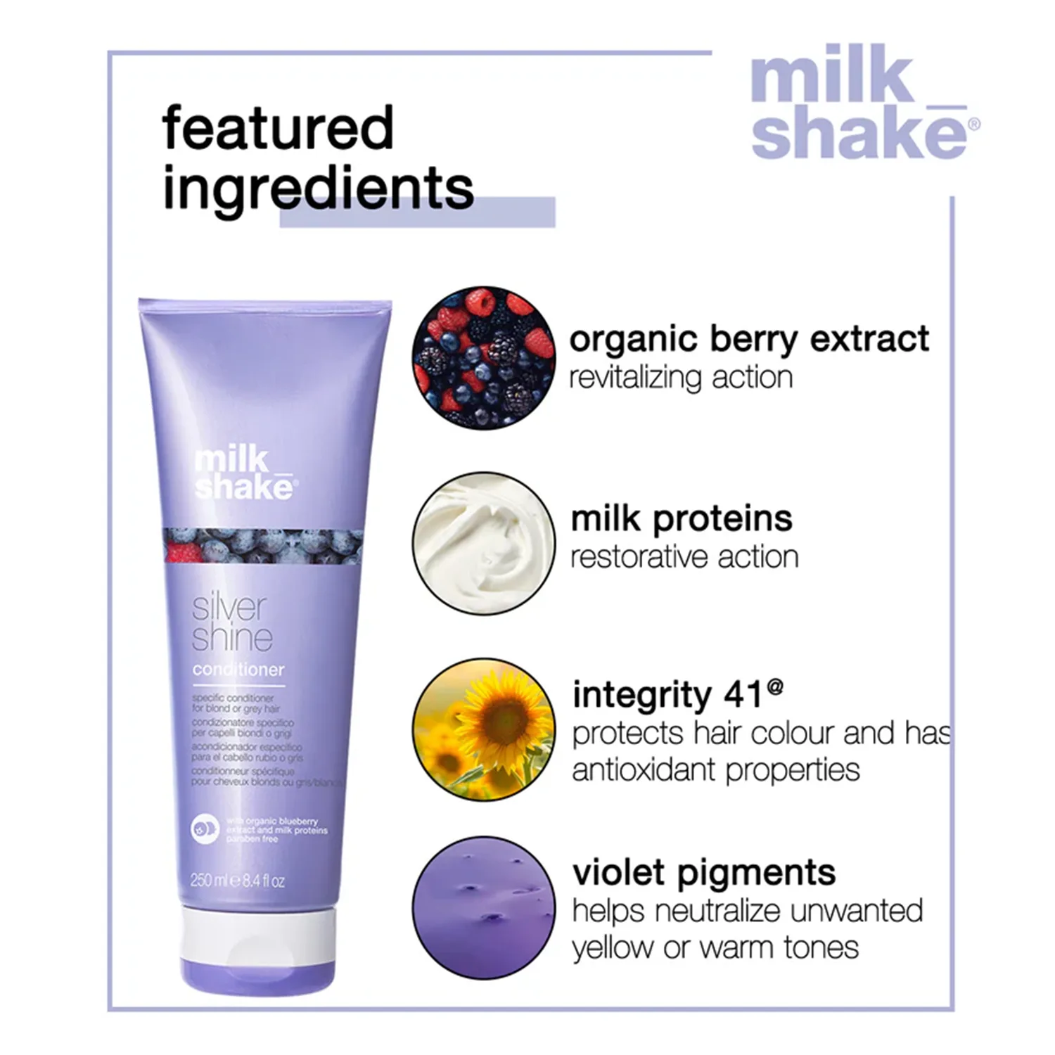 Les ingrédients actifs du ‘milk_shake® Silver Shine Conditioner’ sont soigneusement sélectionnés pour leurs propriétés revitalisantes et neutralisantes, capables de neutraliser les tons jaunes ou chauds indésirables.