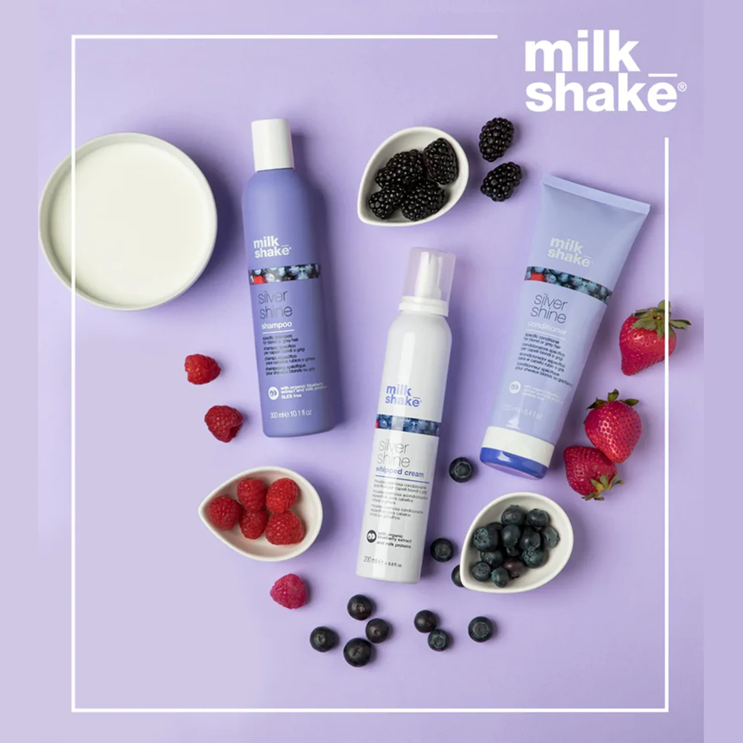 Le parfum de la gamme ‘milk_shake Silver Shine’ est une magnifique expérience gourmande : les notes de tête de myrtille, de mûre et de framboise se mélangent à des notes de cœur florales. Les notes de fond sont composées de douces tonalités musquées qui laissent un parfum délicat sur les cheveux.