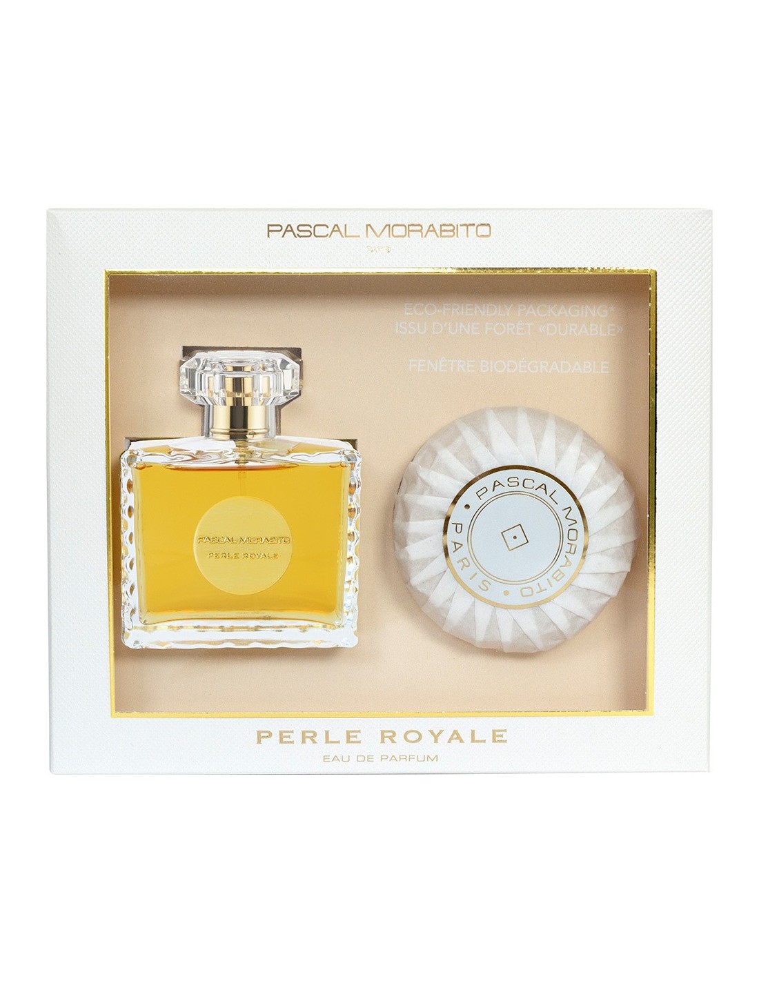 le flacon Perle Royale Eau de Parfum (100ml) se double du tout nouveau savon (100g) facile à emporter partout